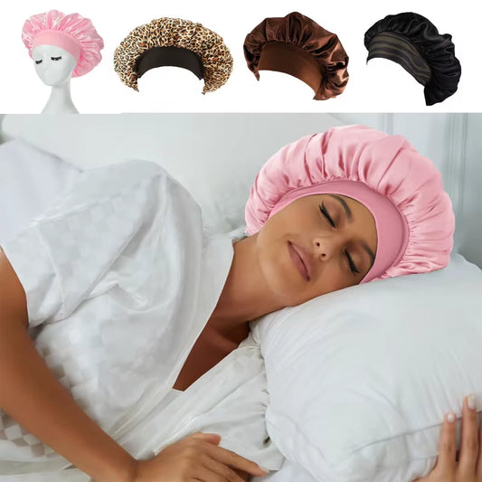 • Satin Bonnets Night Sleeping Cap Large Elastic Wide Soft Band Colorful Silk Hat for Curly Hair Care Beauty Makeup for Women